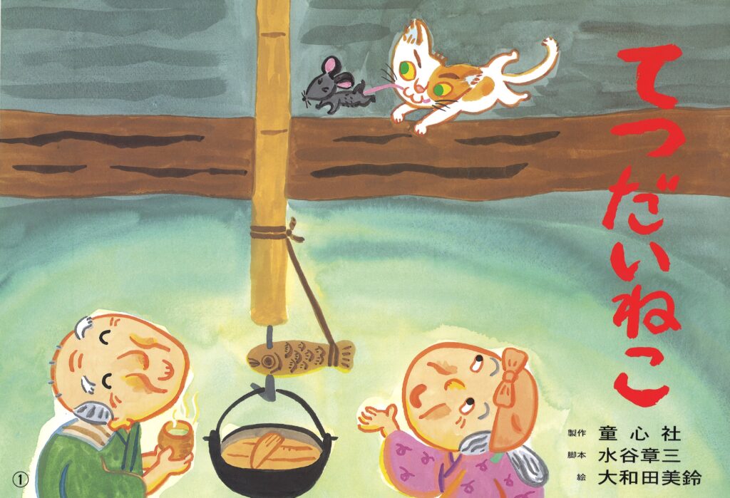 江口文四郎編による『せんとくの金』(山形とんと昔の会)の中の話を脚色したもの。絵はぬくもりのある柔らかいタッチに、遠目がきくように 線描で縁取りがなくとも効果的に仕上げているうえ、猫の表情が実に生き生きと描かれ、猫が人間の会話を聞き、いきなり前足で床をたたいて立ち上がる場面も脚本のテンポに合っている。また、子猫の名を観客に問う展開なども含めて、新しい民話紙芝居。